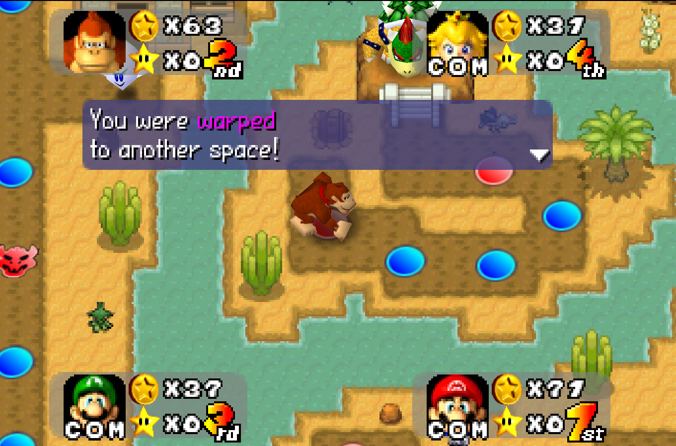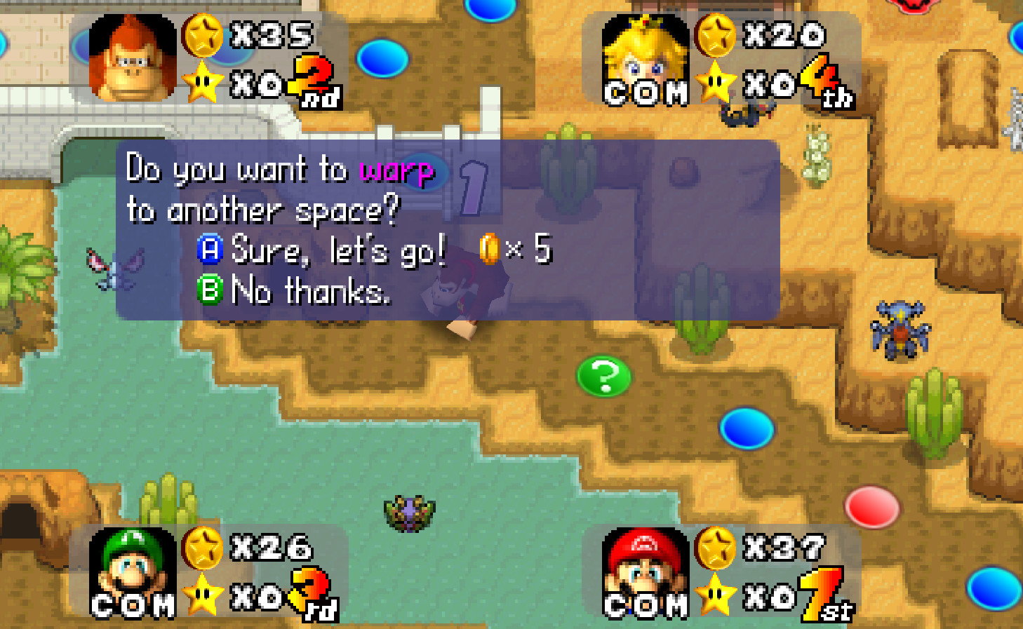 This map contains a center island which can be accessed by passing by the cave entrances and paying 5 coins to go back and forth. All Bowser spaces have been changed to warp events, sending you to a second mini island with Bowser on it. The warp out of Bowsers island takes you back near the start. There are also 3 communism spaces and 5 star spaces as well as a Boo space!