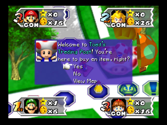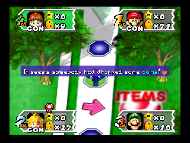 This board is pretty much a typical Park place, however sometimes you can find Mushrooms on the ground or even Coins! This area is split up into multiple paths, each with varying use depending on what you need. Be sure to strategize on what's most important to you at any given moment.