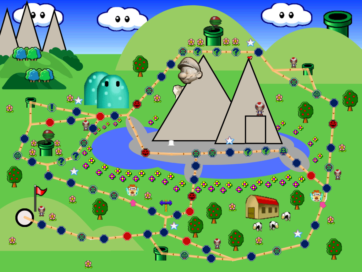 Mount Mario is a small(ish) board in space count, but it has a lot of movement options. There are a set of warp pipes that you can use to move in a clockwise rotation, providing large shortcuts. there are also happening spaces at the bottom of the mountain that give the next player double dice blocks, so try to avoid them. item shops will also be frequently visited.