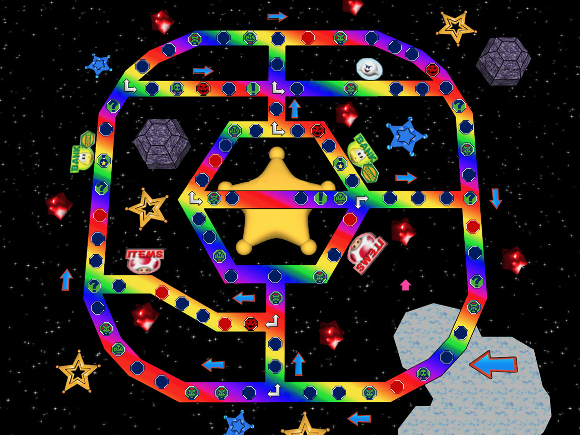 My first Mario Party 3 board, and the first custom board I started working on! The main concept here is the center loop where you can pass an item shop every 18 spaces. It'll be interesting to see how this is abused, and how that affects the way this board is played. There was also a double Boo area where two keys would be required, but that is not possible at the moment.