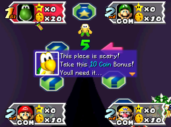 Yoshi ended up being the superstar, so his wish was going to come true. If you remember, Yoshi wanted to eat the Gigaclover. Disappointed about their loss, Mario and friends helped Yoshi cut the giant plant down for a feast of epic proportions. However, little did they know that doing so would plant a horrible curse on them all! Oh, did I leave that part out in the last board? My bad. Anyways, with one swift swing of Wario's axe, the stem snapped and out came a purple aura that engulfed the Gigaclover's entire body. It had now become an entity of pure evil that would inflict bad luck on all with no remorse. It's also a real big jerk now. Of course, Mario and friends were the first to be inflicted.