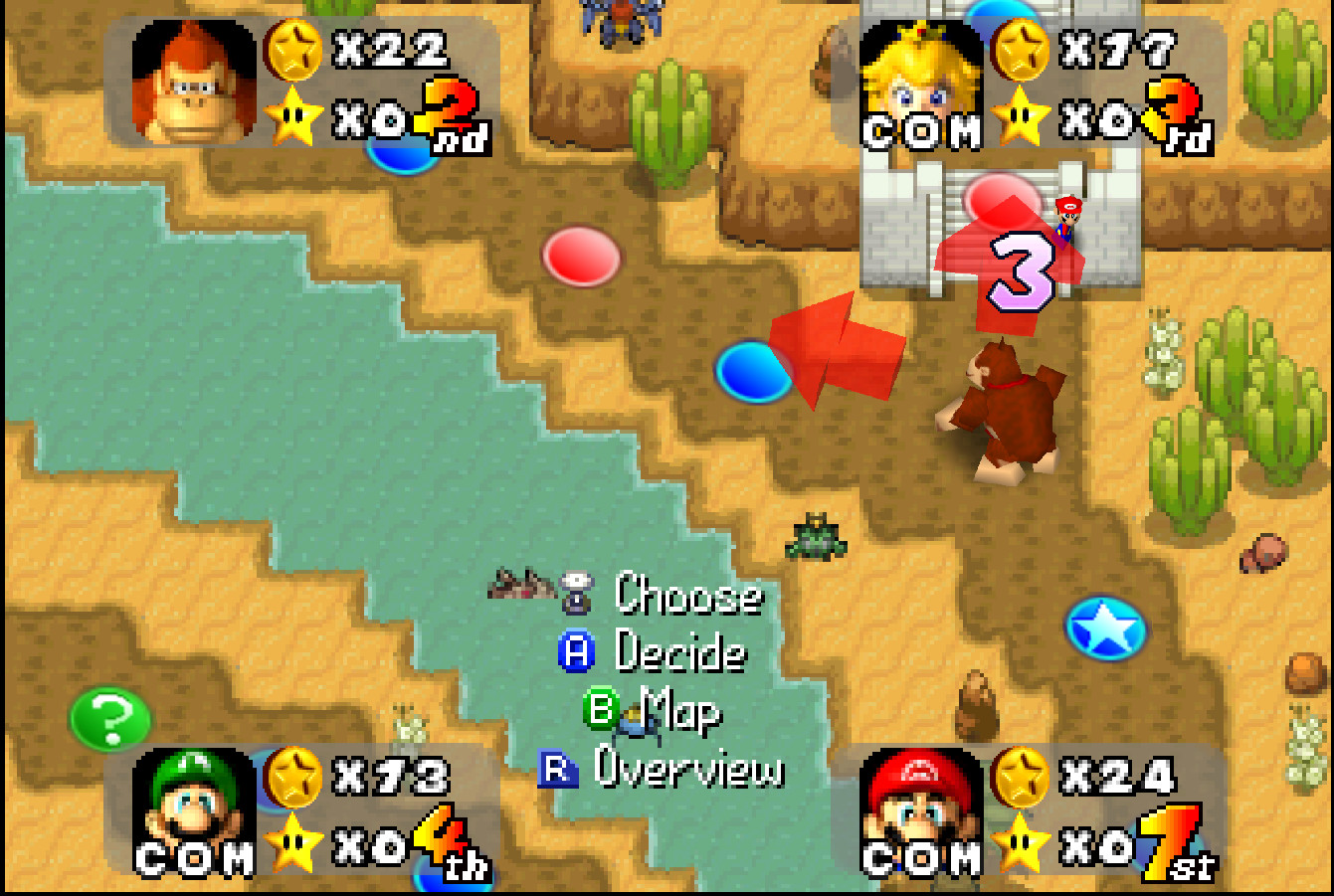 This map contains a center island which can be accessed by passing by the cave entrances and paying 5 coins to go back and forth. All Bowser spaces have been changed to warp events, sending you to a second mini island with Bowser on it. The warp out of Bowsers island takes you back near the start. There are also 3 communism spaces and 5 star spaces as well as a Boo space!