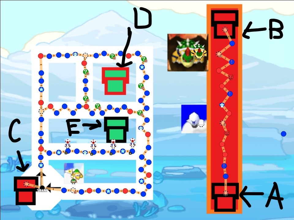 If we divide these pipes into A,B,C,D,E pipes, like in the second picture, we can find that all the ? spaces events are directed to D pipe. The D pipe can send you to the A or E pipe. The A pipe leads to the unlucky path, while the E pipe has many stars. It's a pretty crazy, risky game of earning stars. The B pipe is connected to the C pipe.