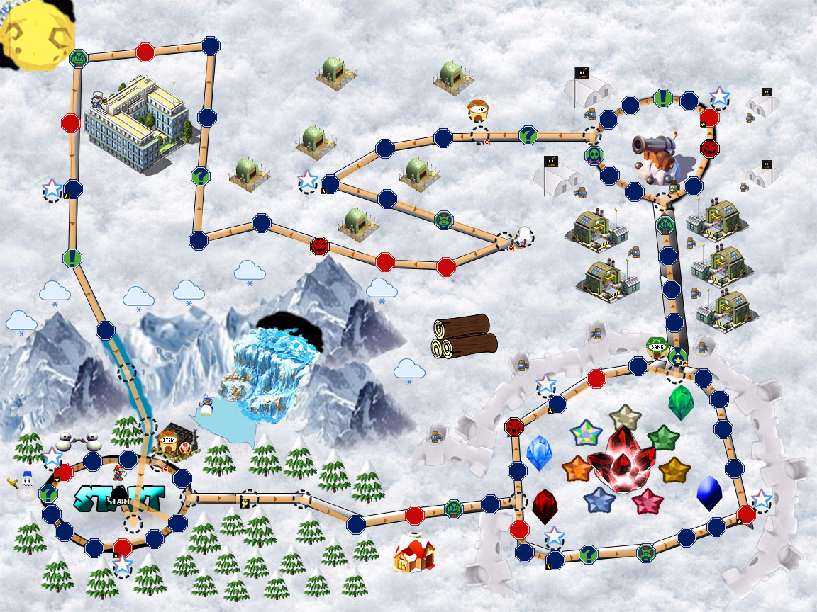 In a Snowy Base filled with Bomb Omb's, You are the objective to find the stars you seek. I DK had made a board based off of Paper Mario The Thousand Year Door called Fahr Outpost.