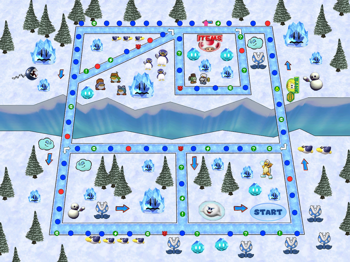 A Mario Party 2 board with an icy/snow theme. The goal is to have the train from Western Land be the main attraction here that would take you across the giant fissure in the middle, but alas, that is not currently possible. Also, the board is animated! The Freezies glow on and off.