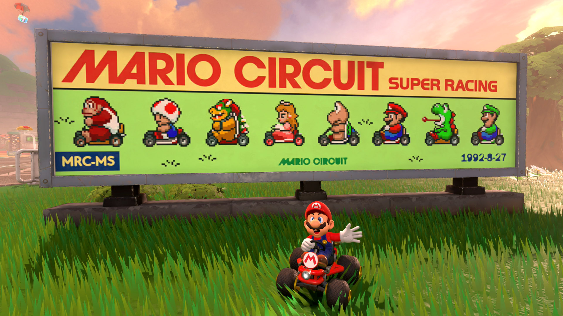 Head over to the northern entrance of Mario Circuit to find a nostalgic billboard featuring character sprites straight out of Super Mario Kart. The billboard specifically calls out the SNES game’s title screen where the eight playable characters ride across a grassy terrain.