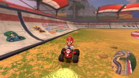 There’s more! Stickers of the original eight characters (Mario, Luigi, Peach, Yoshi, Bowser, Donkey Kong Jr., Koopa Troopa, and Toad) can be seen slapped around Mario Circuit. Find them in various poses on ramps, behind billboards, and even around the starting line banners.