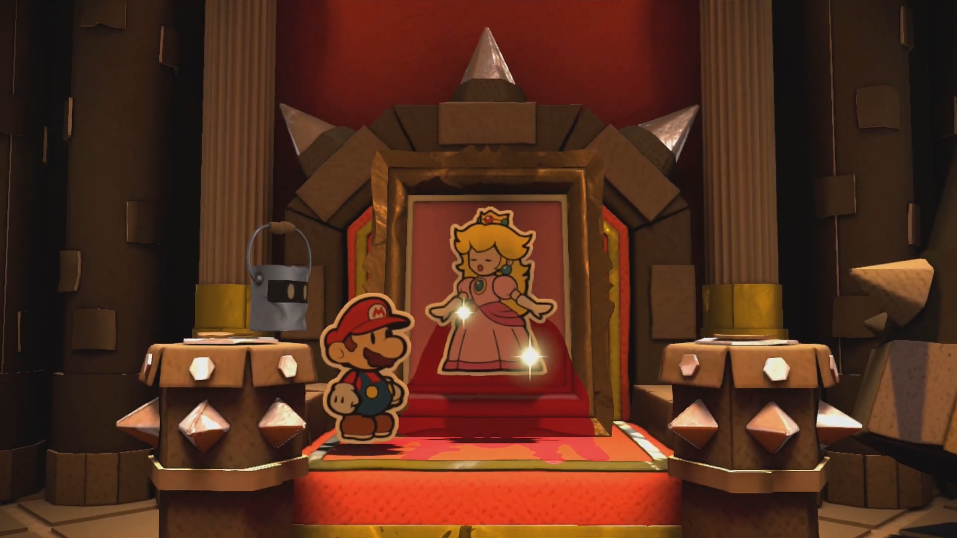 Head inside and walk down the hallway to find Princess Peach colorless and pinned to a frame. Try whacking it off the wall only to open a trap door beneath you.