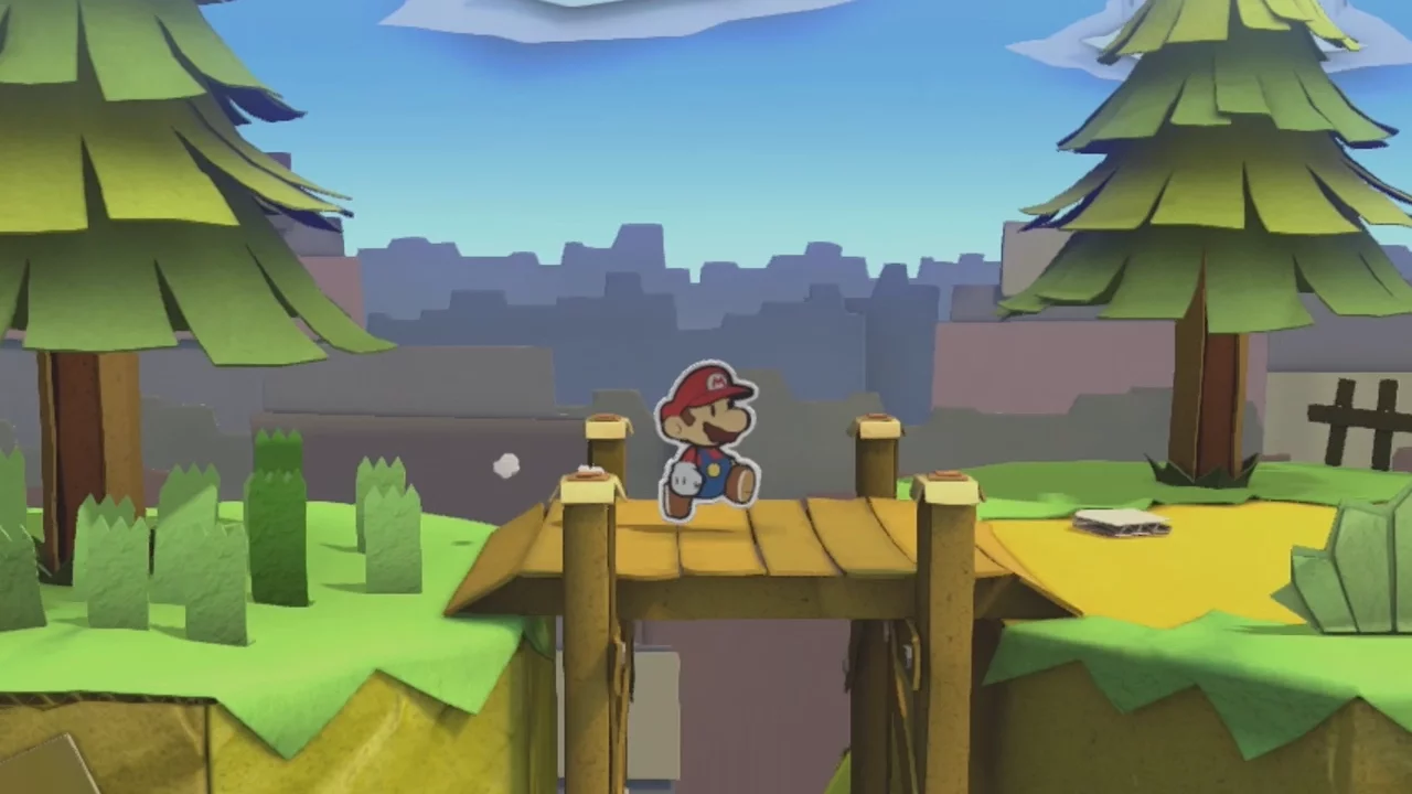 After the fight, hit the cut out section of the wall on the right to form a hole, then hit the yellow section of the wall on the left to reveal the !? Block. Use it, then run to the log and unfurl to reveal… a broken bridge. If you’ve been paying attention to the signs, you’ll notice that this sign says to hit this with the Unfurl Hammer. Grab the power once again, then hit the sign to reveal the real bridge.