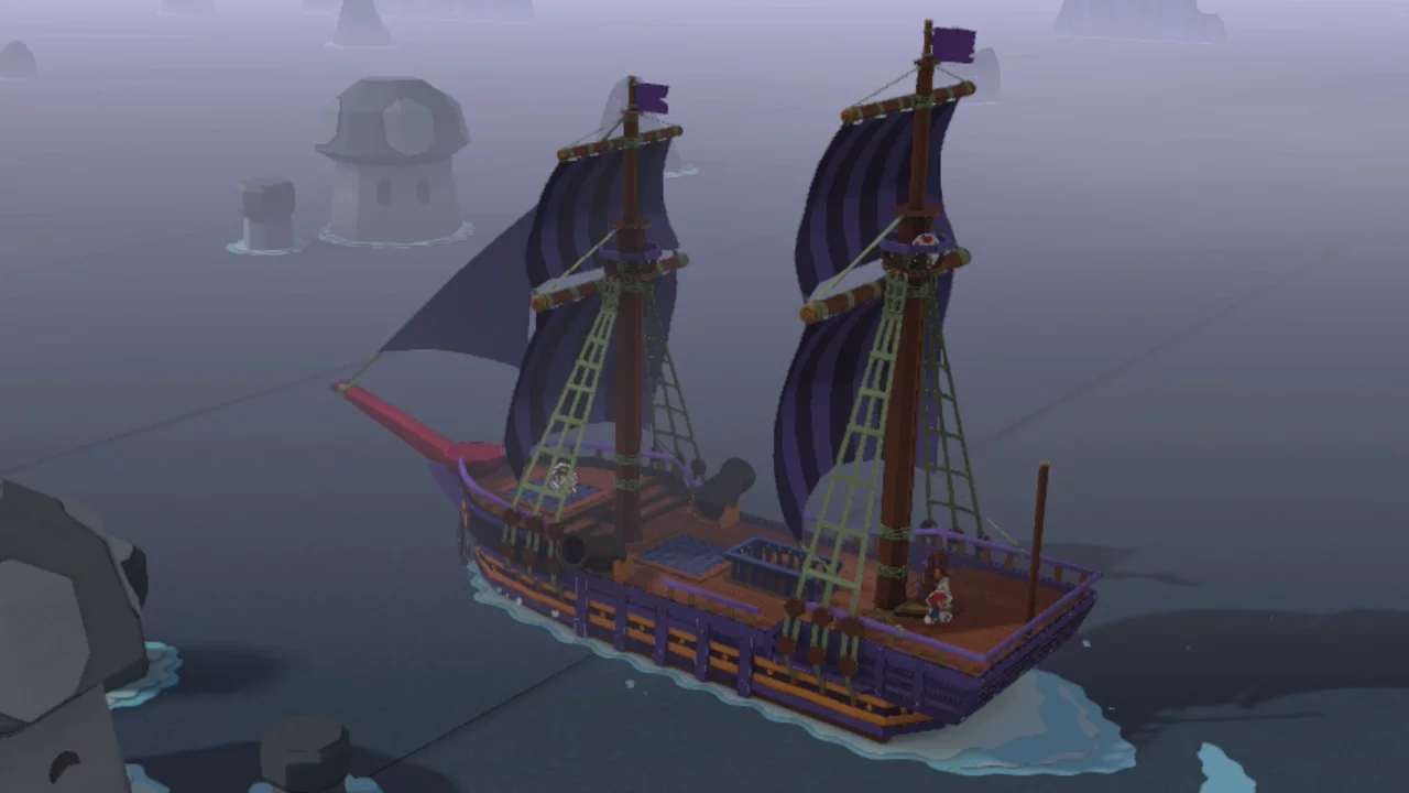 Once you’ve done all this, you’ll enter the mysterious purple fog. Head downstairs to find that the Toad patched up the leak and found a flag. Go back upstairs and use the cannon on the right to blast a cannonball into the mountain.
