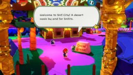 With Professor Toad as your partner, return to Shroom City and start reading up on the ancient text you couldn’t translate earlier. There’s a hidden Coin Bag you can dig up in front of the ancient text on the side of the shop building.