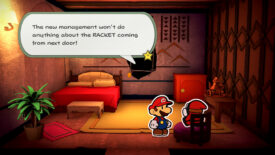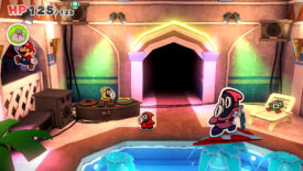 Enter the middle door to find the DJ shop. Use the counter to reach the top of the boxes on the right, then whack the Toad on the shelf. Too bad it’s not the owner! Don’t leave just yet, there’s a hole you can punch through on the left wall, all the way in the corner. This will take you to the last room where you can grab the treasure chest on top of the crates.