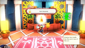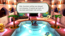 Enter the suite of the hotel and check out the mural on the wall. Practice the ritual depicted on the mural, then check out the suite for some collectibles. In the bedroom, step onto the left mini desk and jump to reveal a hidden block with a Shiny Mushroom. There’s also a treasure chest in the bedroom. You can read the murals in each of the four rooms downstairs but they just depict the story of King Shroomses. Nothing major. Now it’s time to set off to find a place to do the ritual.