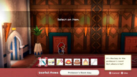 Walk into the main lobby of the hotel and immediately whack the luggage cart to the right to save the crushed Toad underneath. Speak to the Snifit at the desk and he’ll give you the key to the professor’s room, no questions asked!