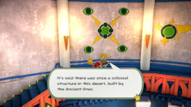 Now that you’ve read the murals on the second floor of the hotel and the suite room, head back to the Scorching Sandpaper Desert. Head to the center of the desert, actually a little closer to the right side, and look for a ring of six bird statues. Hop off your Boot Car, and use your hammer to smack each statue and turn its direction. Have all six birds face the center of the ring to have a stand and microphone pop out of the ground.