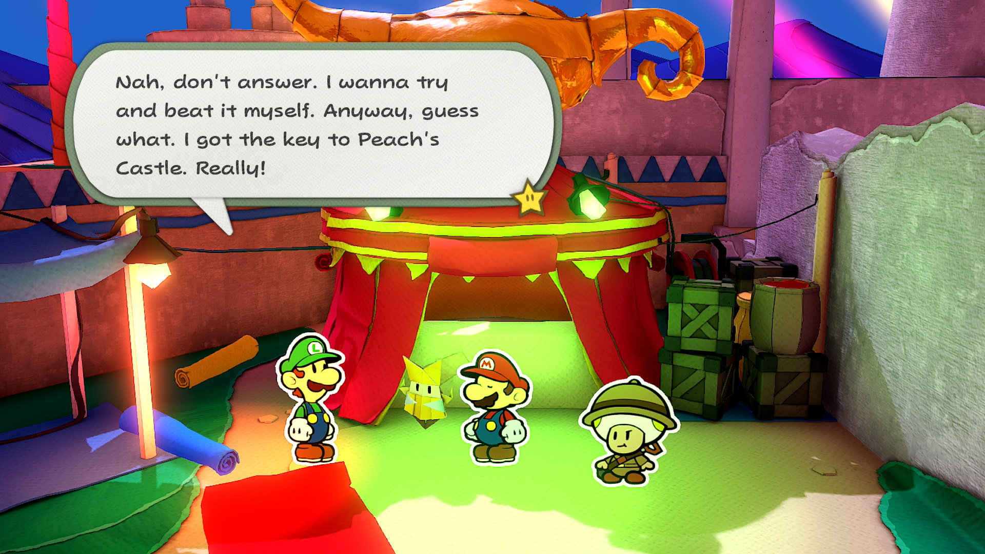 The Snifit will take off and drop a magic circle on its way out. Whip out your 1000-Fold Arms and rub the lamp to release Luigi from his prison. And yeah, he got a key, but it’s not the one from Peach’s Castle. But it is the one we need to enter the hotel room!
