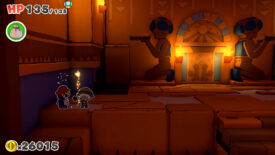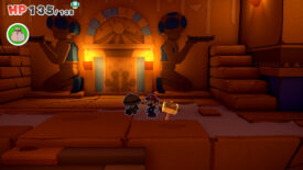 Go through the big door to find a group of mini Scuttlebugs feasting on a Toad! Whack the little creatures off and yank the poor thing out of the ground! IT HAS NO FACE!! Uhhh, no matter! Before dealing with the coffin, let’s work on picking up some of the collectibles.