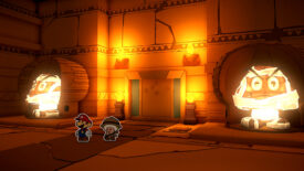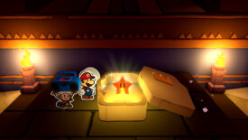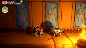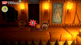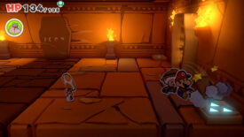 Take note of the chest and warp pipe above, then walk into the next room. You might not actually have enough confetti to patch up the two holes on the walls of this room, so head for the door to awaken two mummified Paper Macho Goombas. Take them out like you did the other Goombas earlier in the game, then collect all that sweet confetti!