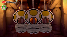 You found Professor Toad, beat the Fire Vellumental Cave, and activated all four towers. Now it’s time to take on the Temple of Shrooms! Enter through the bottom entrance. Watch out for the mini Scuttlebugs that fall from the ceiling and make sure to patch up the hole on the left!