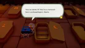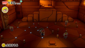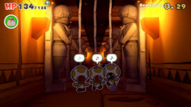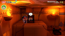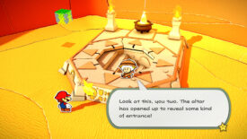 With Hole Punch completely wiped and the Toads reunited with their faces, head up the stairs and into the room with the streamer. Use the magic circle and rip that yellow streamer to shreds. The disco ball will come crashing down and reveal the missing sun. The desert is orange once more! Plus the sun altar will open up revealing a secret entrance.