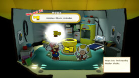 Speak to the Monty Mole on the pier to purchase the latest boss inspired collectible treasure for 798 coins. Beyond that, not much more to do in Toad Town. Head over to Picnic Road and enter the Sensor Lab to get the Hidden Block Unhider. If you haven’t already, don’t forget to take your Shriveled MAX UP Heart over to the lake in Whispering Woods to rejuvenate it.