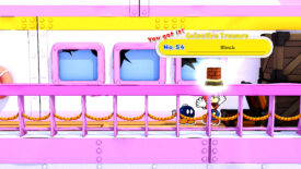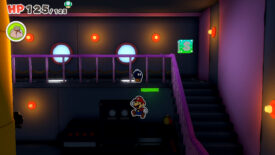 Now you can enter the Main Hall. Three holes to repair, two on the floor and one on the right wall. Whack the crumpled Purple Toad on the left. He’ll scream and… well, that’s it. Check out The Princess Peach collectible treasure on display on the right. Snifits will try to ambush you, so be careful! Trying to use the elevator is no use since the power is out. Head in the room on the left and fill in the hole in the ground. Bust through the doors on the left.