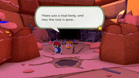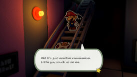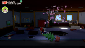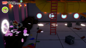 Patch in the hole on the engine, then place the Lever you found earlier in the opening. Whack the now placed lever with your hammer three times to fully activate the power. Climb up the stairs, but take note of the broken rope near the Save Block. Walk through that space and fall down below where you’ll find two holes to patch along with a Toad to save.