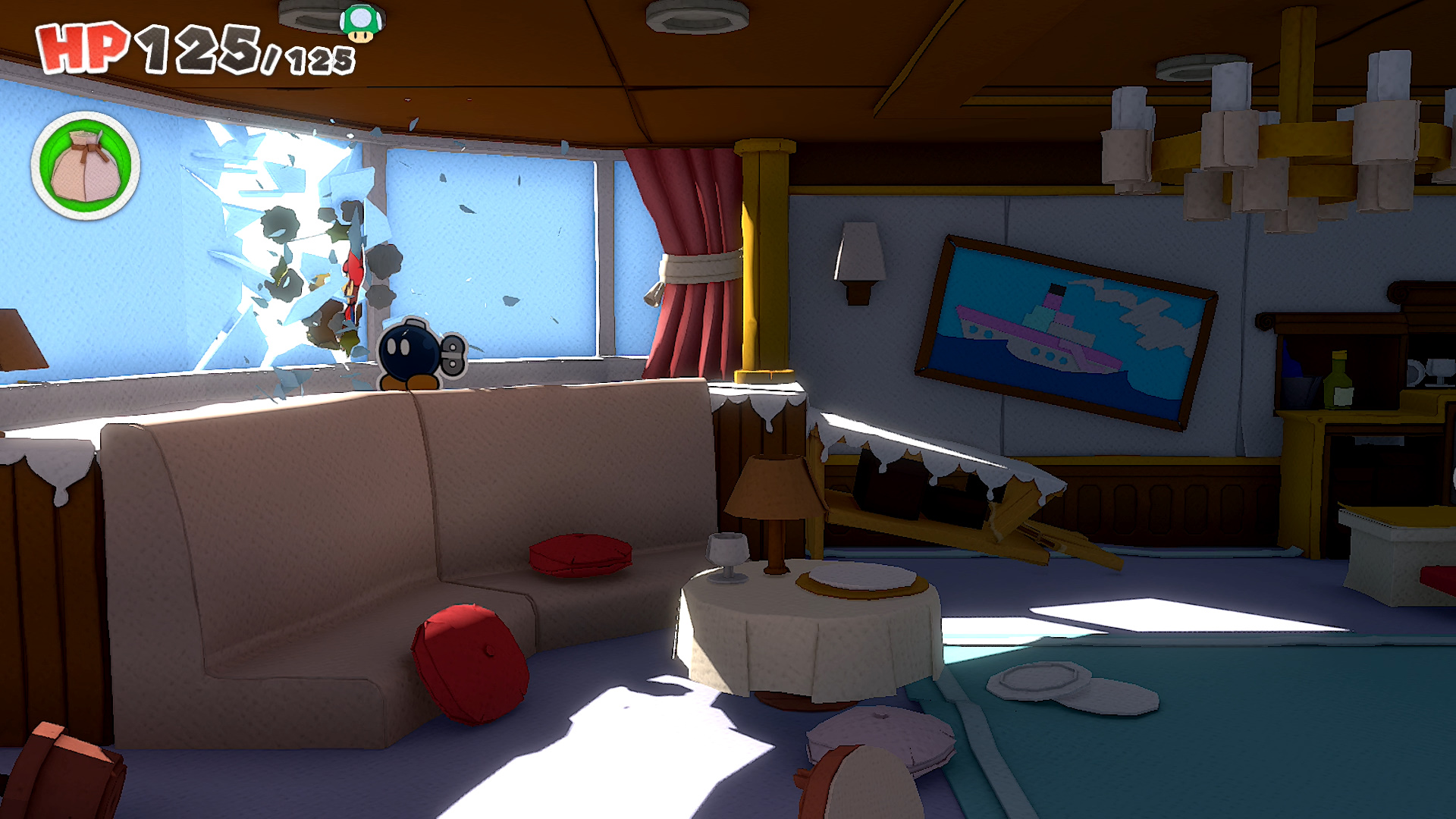 Walk through the hallway and into the previous room to find… black goop everywhere. Go back outside but this time go right. The clutter blocking the path earlier is now lowered and you can enter the Main Hall again. Run to the elevator and ride it up to the VIP Stateroom. Very Icky Paint apparently. Hit the block on the right for Shiny Boots.
