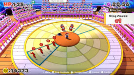 Another busted up room. Whack the Purple Toad flower vase by the bar and fill in the hole in the center. Repairing the hole will prompt a Snifit ambush! Slide the middle Snifit out one, then twist the outer ring to match them all in two lines. For the second wave, focus on all slides. One slide can instantly make a line of four while two other slides can form a square for a hammer attack.