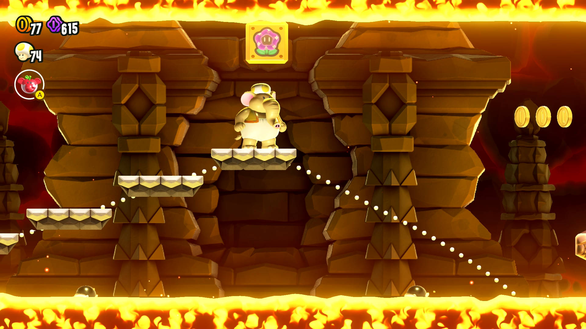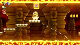 Another Flower Coin above the lava, but this time there’s no platform. Drop down and bounce off the Spiny Shell to get back safely, all while collecting the prized coin. Make sure part of the moving platform has moved to the right side so that you have somewhere to land!