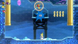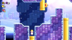 As you’re moving up the icy platforms, take note of a Condart slamming its rude beak into the wall on the left. While it’s stuck, bounce off the bird to reach the area above. Move to the left, then hit the last brick block to reveal a Propeller Flower. Grab onto it to get taken into a secret zone in the sky. Run onto the first speed strip and switch between the following strips until you reach the end. Make sure to bounce off the Condart at the end to reach the Flower Coin!