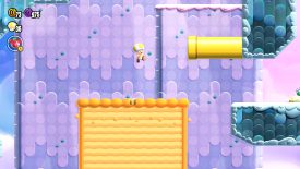 Quickly dispose of the Goombrats and keep yourself in the air as long as possible to let the yellow Puffy Lift rise up to the yellow pipe. Once you can reach the area above, grab the Wonder Flower and start hopping across through the area above, slamming into the spiked blocks without a care in the world. In the last area, put your puffy self into the indent near the brick block, then watch as a spiked block rolls over you and clears the path to the Wonder Seed.