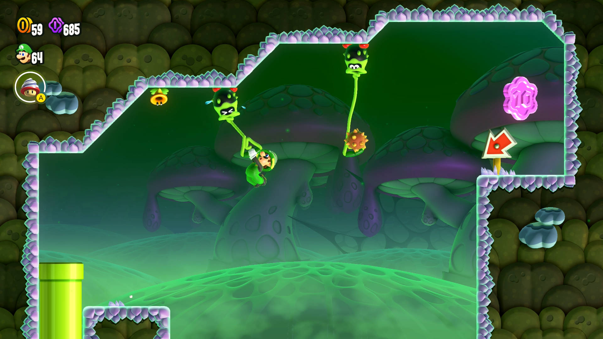 Right after the first Flower Coin, swing across the Taily enemies to reach the tall mushroom on the right. Enter the warp pipe above it, then do the same Taily swinging strategy to collect the Flower Coin.