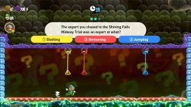 A trio of Taily enemies roam above three mushroom platforms. Defeat them all to reveal a Wonder Flower… and a quiz show?? Here’s the thing. We could list the questions and answers here, but you have 90 seconds to get three questions right. Doesn’t matter how many you get wrong! So don’t think too hard and pick the answer by grabbing the corresponding Taily. You’ve got a TON of chances to get through this.