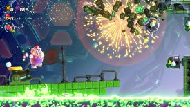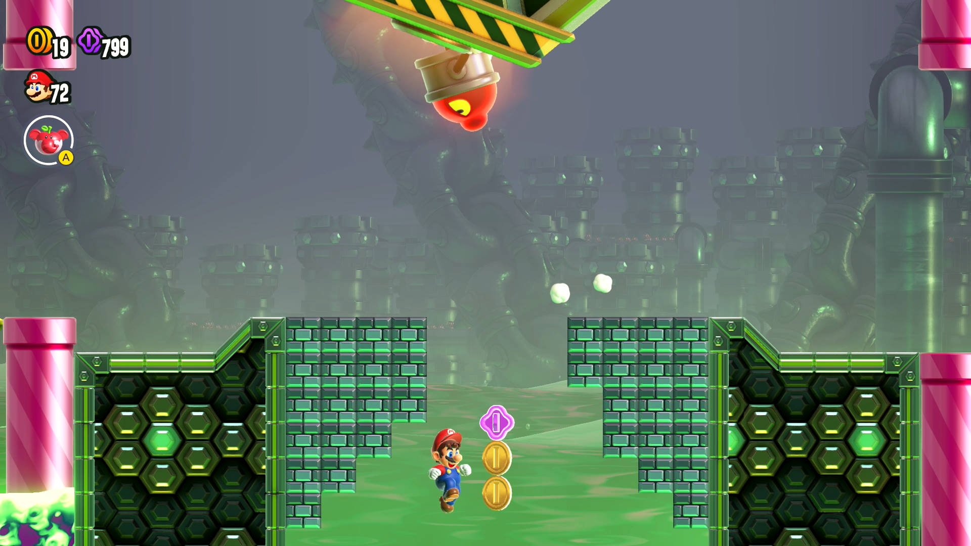 See the brick blocks that act as a bridge over a gap? Let one of the Seeker Bullet Bills rip through the blocks, then jump down. You can also ground pound through. Grab the Wonder Flower and take control of the ship! Step on the yellow switch often and you’ll be able to take out the Seeker Bullet Bills before they can even move. Survive until the end to get your Wonder Seed.