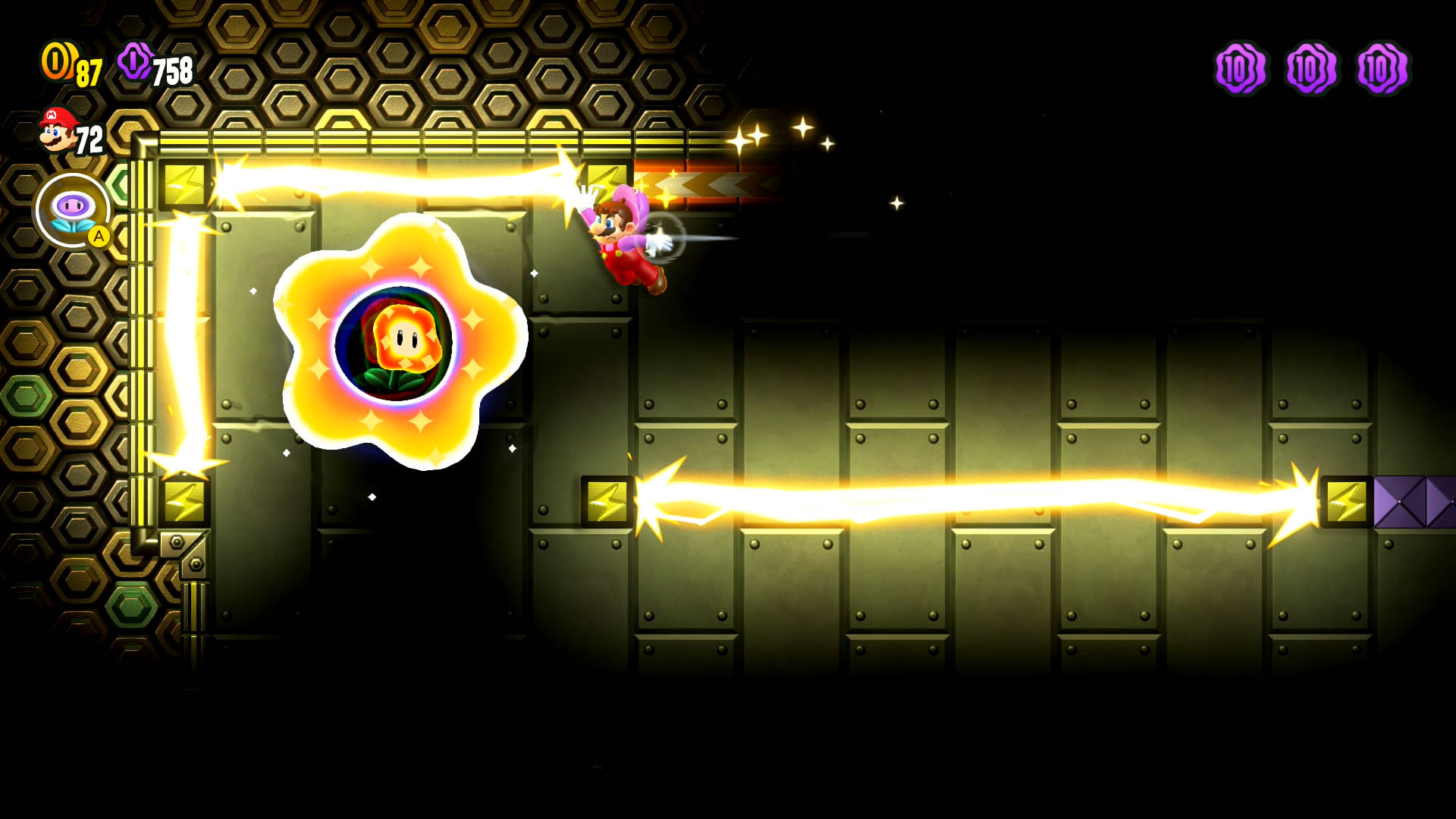 After the Checkpoint Flag is a zip track. Ride it and you’ll hit the Wonder Flower at the end. Now you’re metal form! And that theme!! Your new ability will weigh down your jumps, but you can also pass through electricity and even conduct some electricity to bring in nearby coins. It’ll also light up the area around you