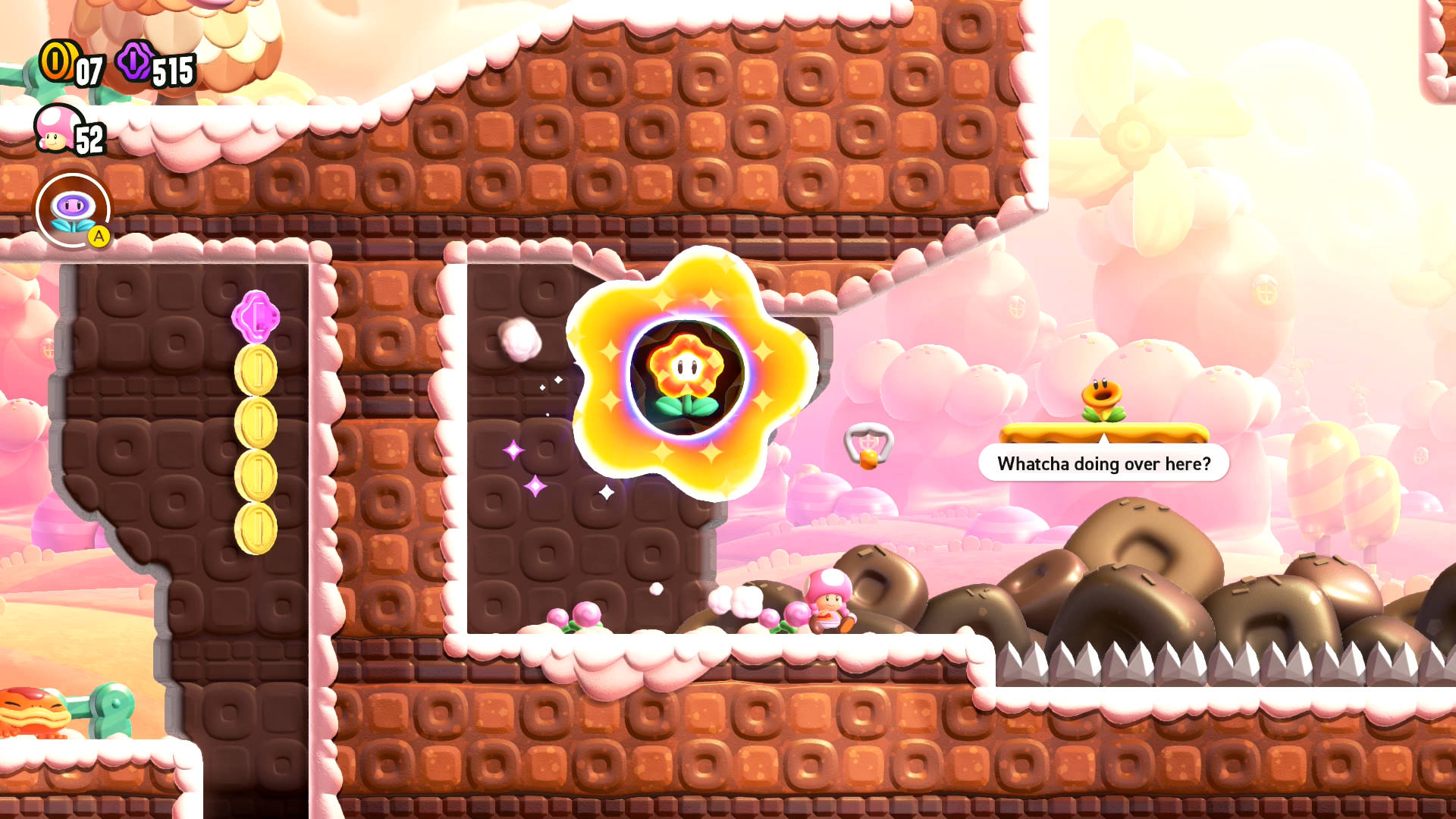 As a Goomba, drop onto the Maw-Maw to take it out, then walk along the spikes to reach the Flower Coin.