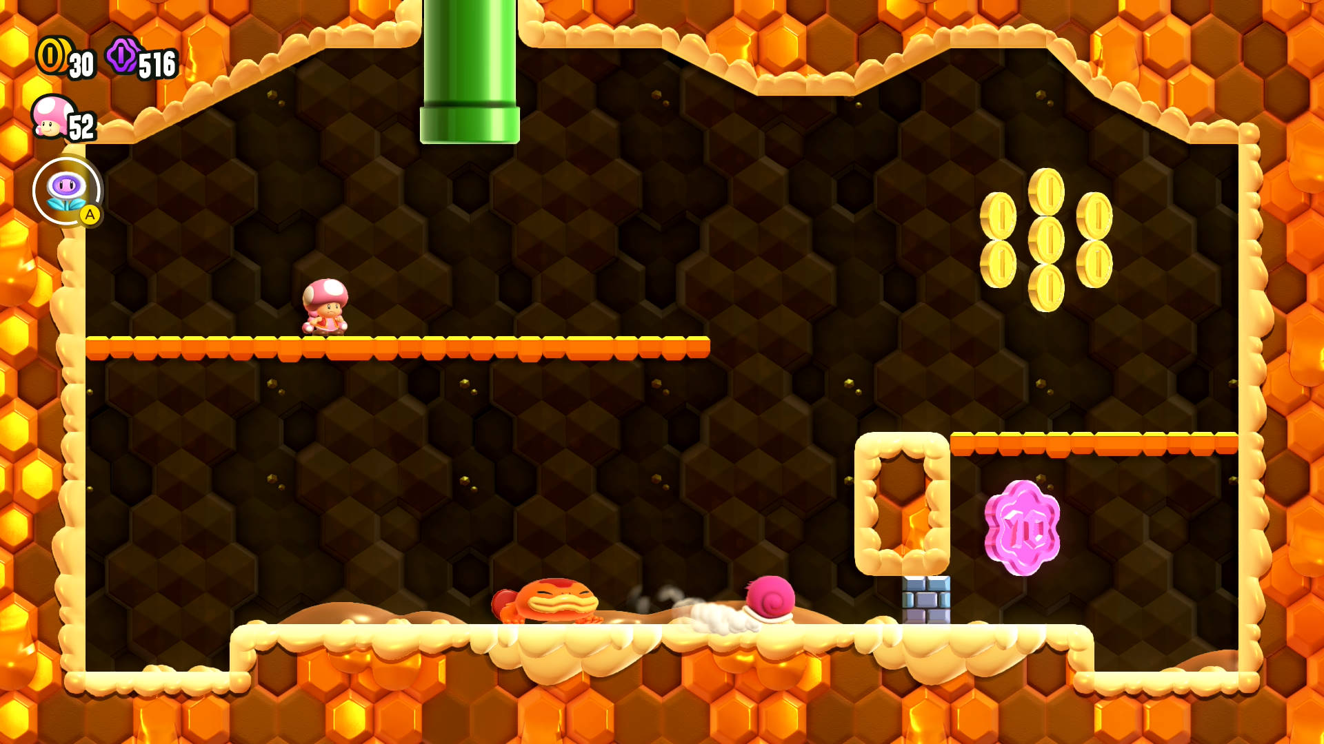 After you collect the Wonder Seed and return to normal, jump to the warp pipe on your left. Once inside, use the shell from the snail to break the brick blocks in front of the Flower Coin. If the Maw-Maw eats the shell, it’ll spit it right back out.