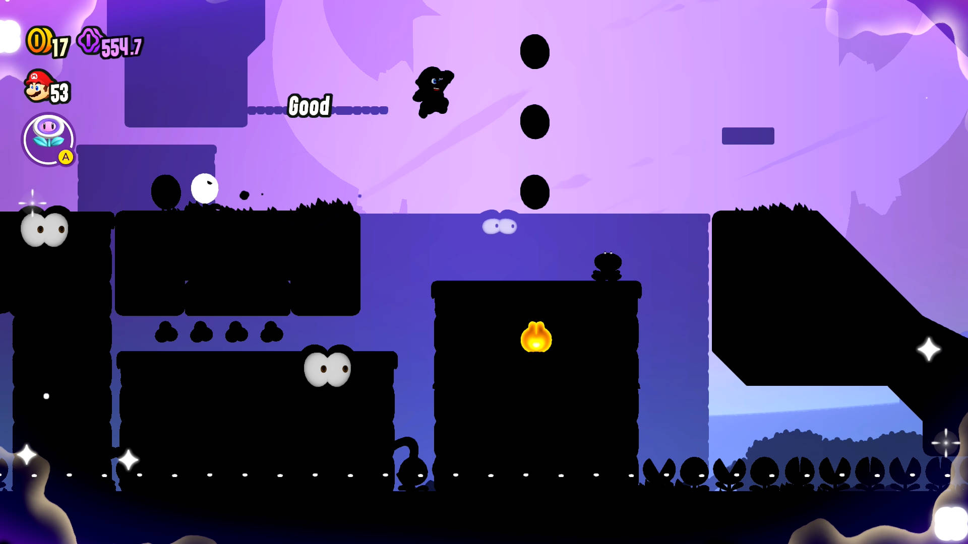 Find the long Question Block in the ground, then slam down on it to have a Star appear. When it bounces over to the right, drop down and grab it. Speed over to the left and ground pound the glowing area where the Talking Flower is at. Wonder Flower time! We’re back to silhouettes, but this time all the platforms with eyes will follow you. Including the massive one in the background! Stepping on the platform with the Talking Flower will send you to the background. Wonder Seed is all the way to the right!