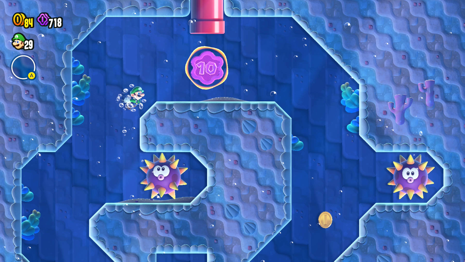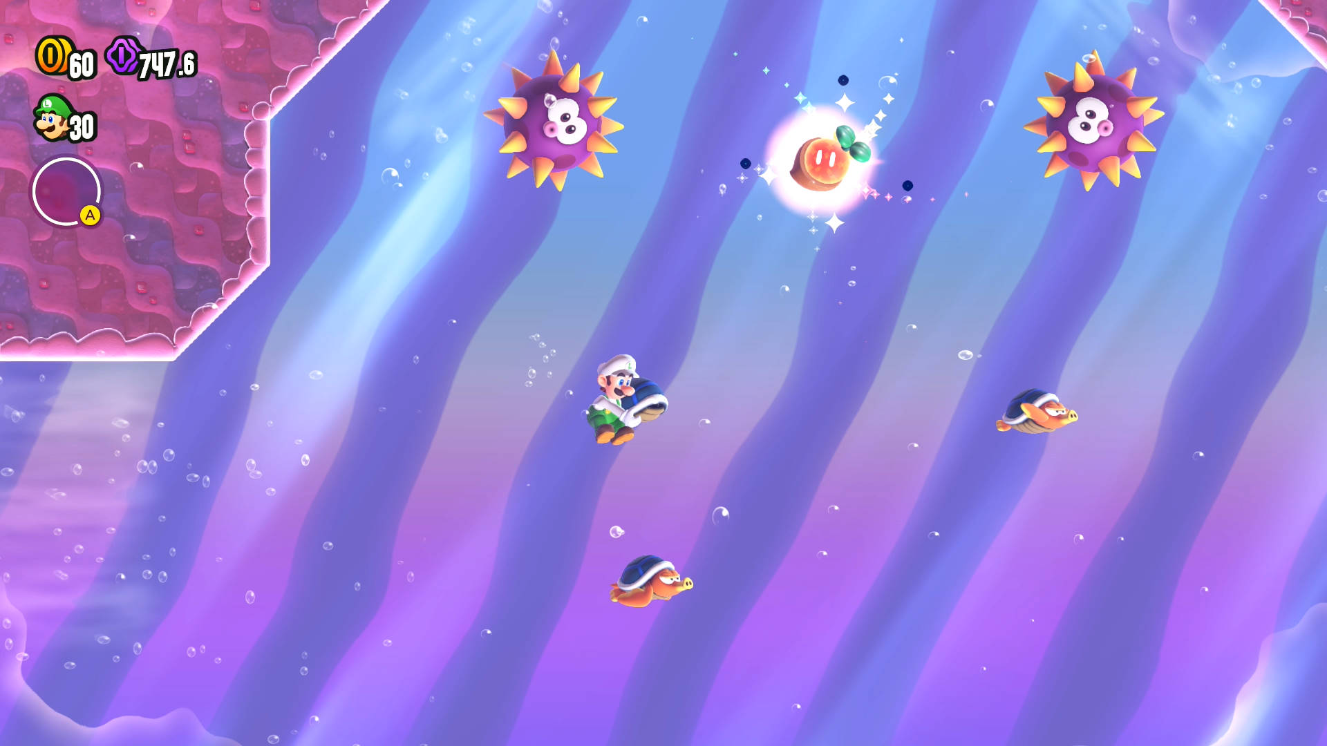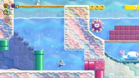 Thanks to the Wonder Flower effect, the path that is normally blocked by brick blocks will be destroyed via a rolling Urchin.