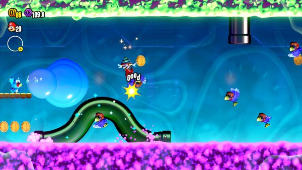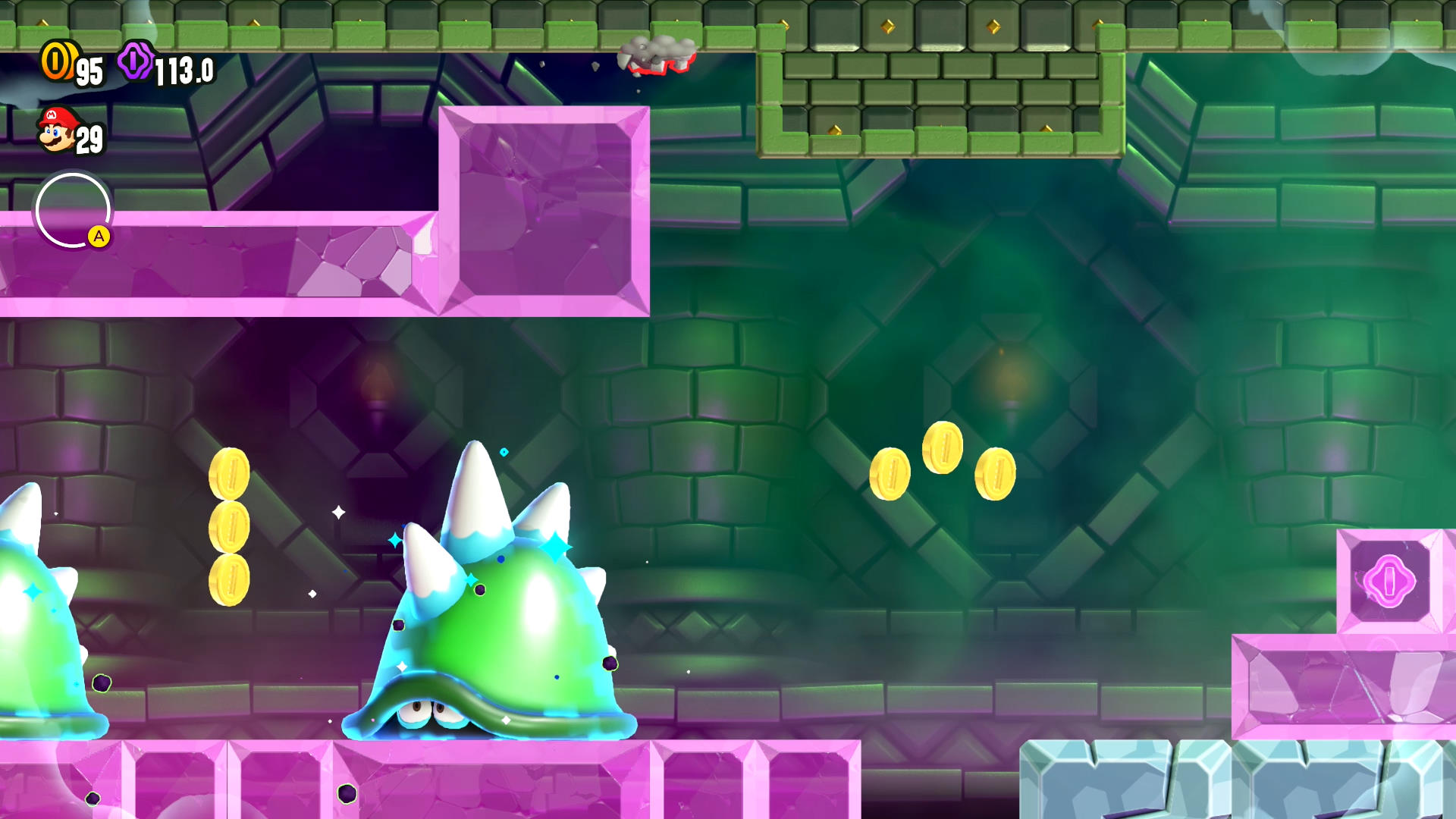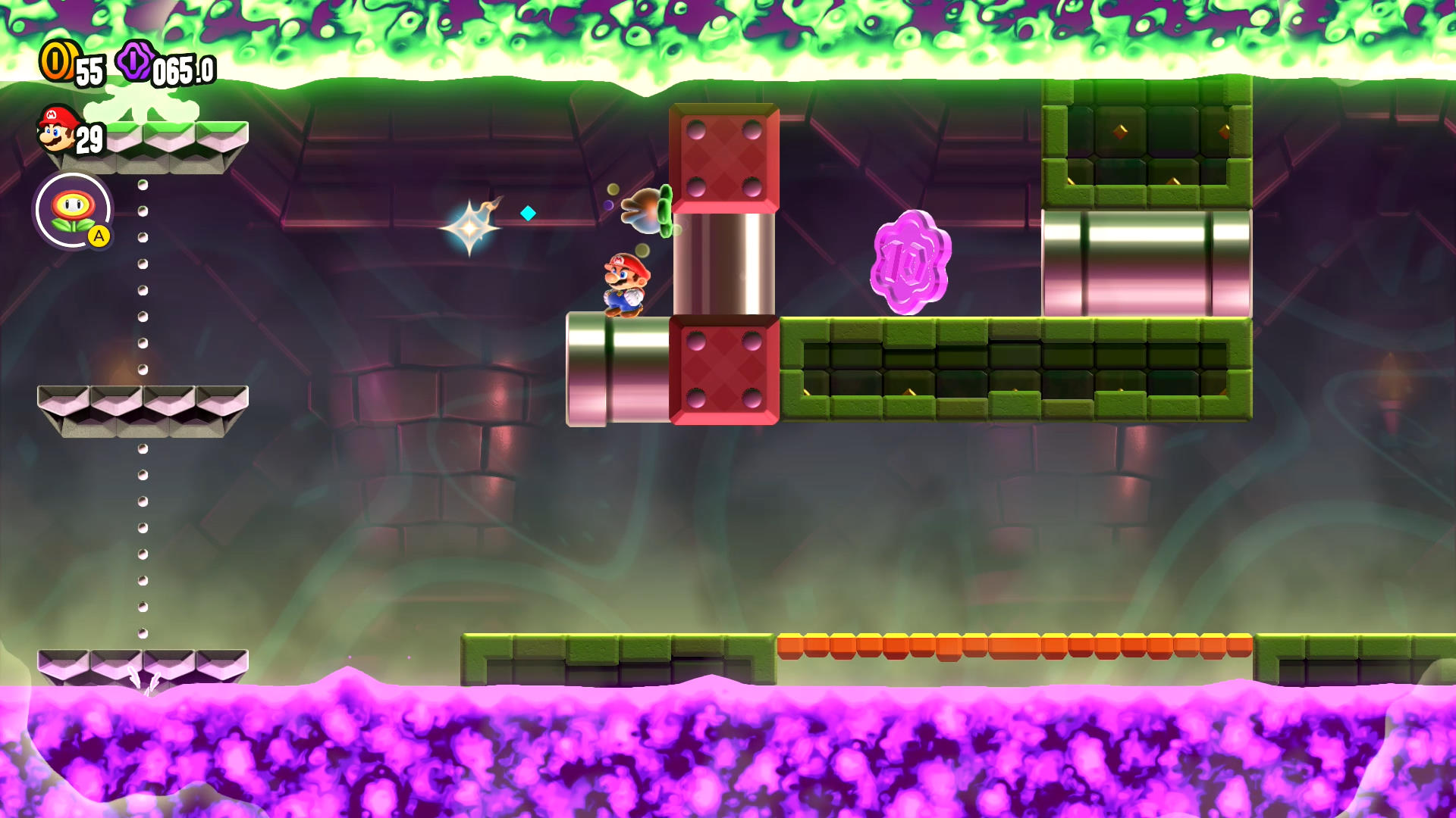 Ride the Wonder Pipe™ as it inches across a sea of purple poison, all while avoiding enemies and obstacles. Nothing too crazy, but do try to avoid jumping when the Wonder Blewbirds shoot out their rainbow bubbles. Those will pop on impact, but bouncing on them will send you into the ceiling of poison. When then Wonder Pipe hits a stop, hop off and continue across the moving platforms. Grab Flower Coin 1 before heading into the next zone!