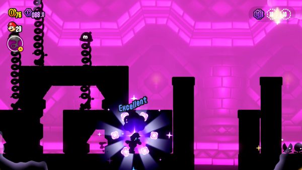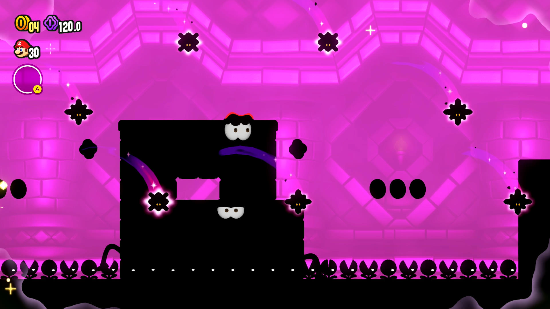 It’s dark! It’s pink! And the Sproings are all active. If you still have that Drill Mushroom, ground pound into the bottom floor and zip past all the Sproings, collecting a Flower Coin in the process. In the next area, ride on the right side of the Tochi to have it take you across the Munchers. If you still have it, use the Drill Mushroom while on the Tochi to peacefully ride to the other side.