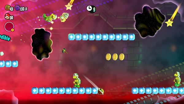 Once you’re off the ship, a wave of dark matter will spawn and start (quickly!) moving towards the right. Start sprinting and jumping over the Hoppos, but make sure to launch yourself off the one that gets stuck in the hole to get over the giant one headed your way. From there, join the group of Rolla Koopas as the reveal where you can jump. Flower Coin 3 is here! Get it jumping off a Koopa or throwing one of their shells up into the Flower Coin.