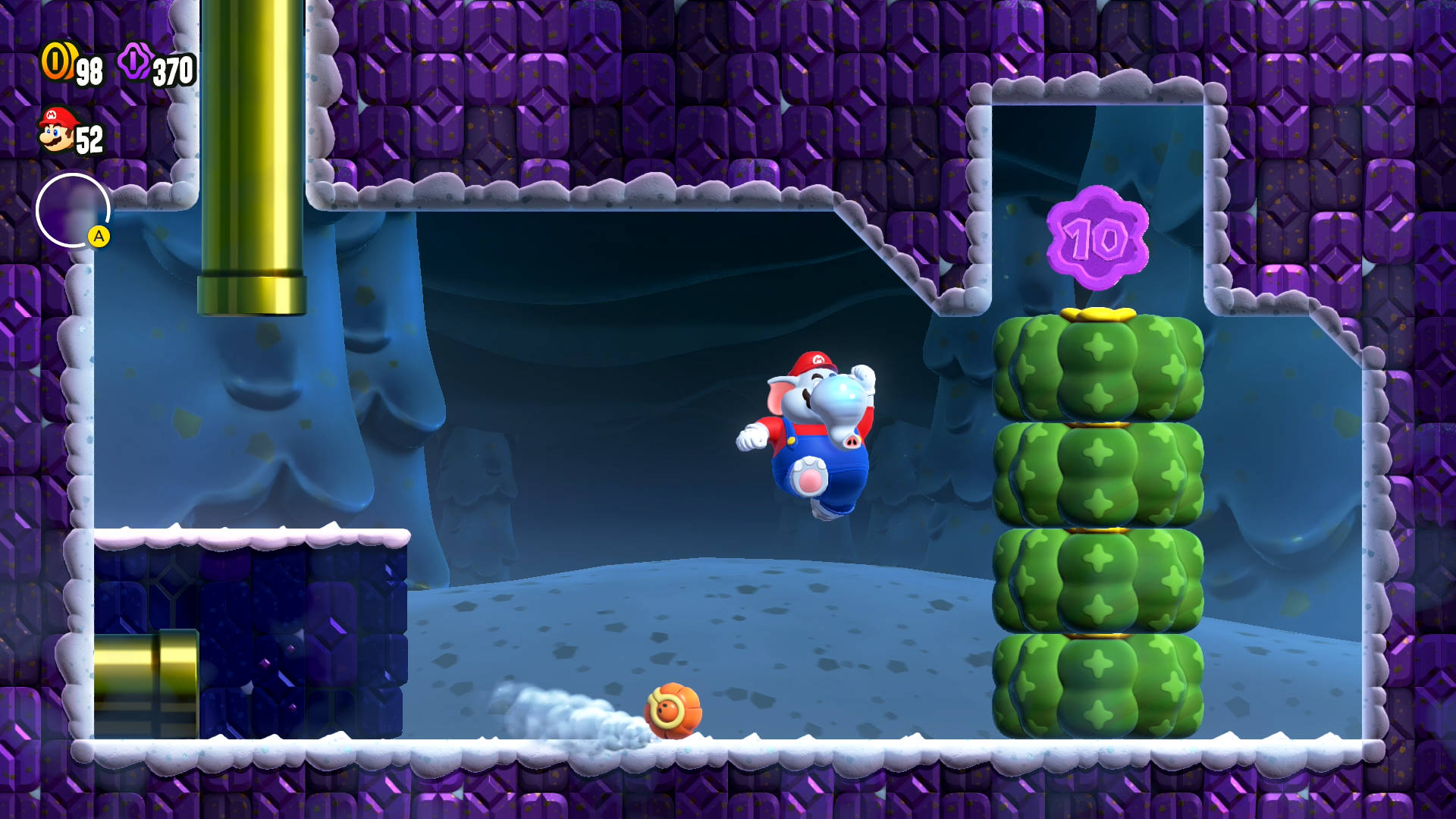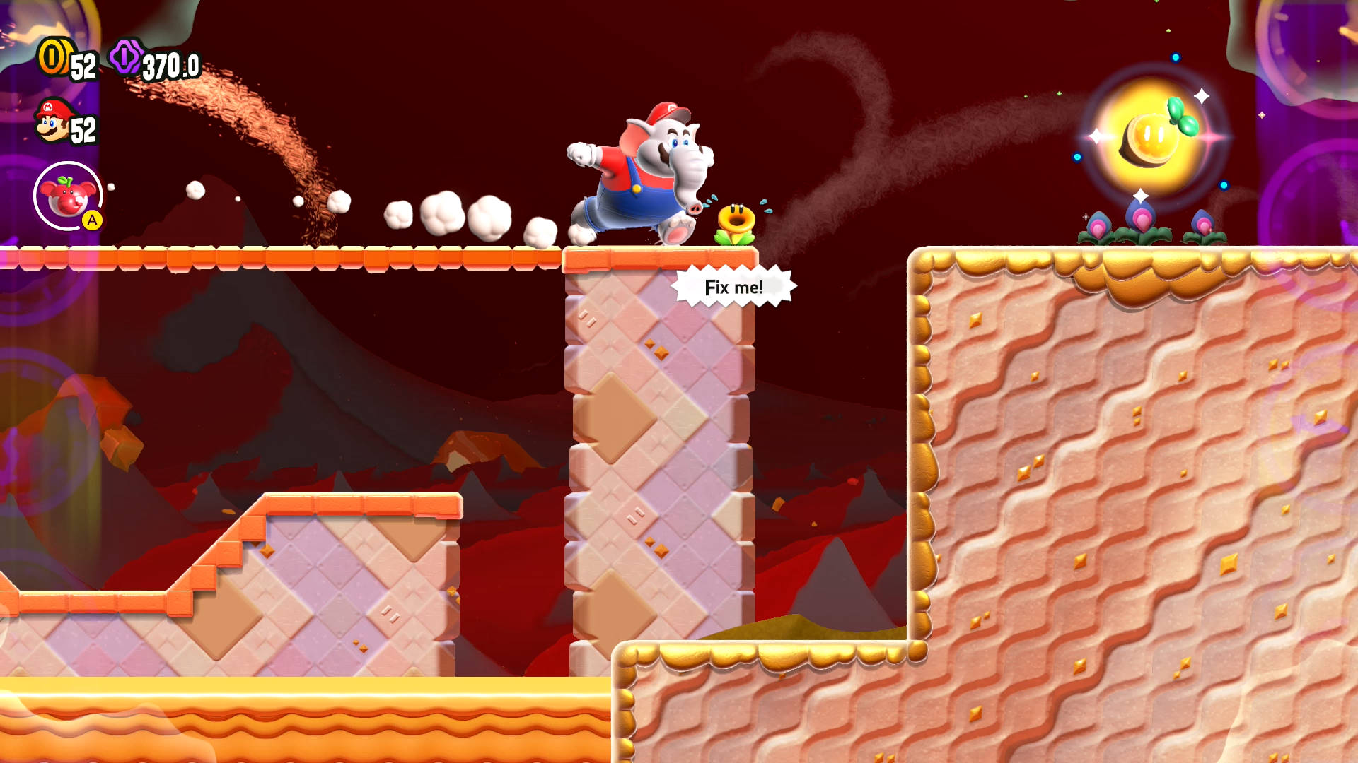 Touch or throw something at the glowing tulip above the Pokey and the smashable cacti. Wonder Flower! Time has now sped up. Be extra careful with enemies and you’ll do just fine getting to the Wonder Seed at the end.