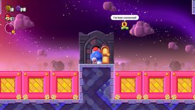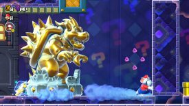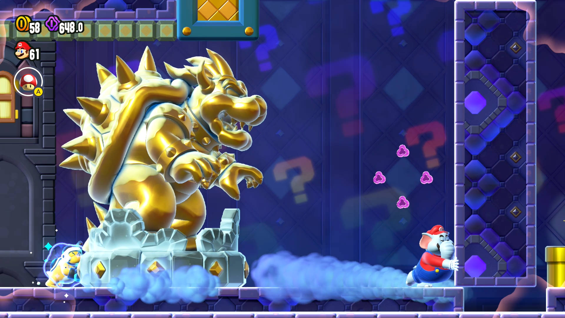 There’s a suspicious single wall with what seems like a space for a door. Push the surrounding pink blocks into the hole to have the door appear. After grabbing the Wonder Flower in the next room, a Shova will start pursuing you with a golden Bowser statue. Let it squash you and you’re toast! Goal here is to keep running the to the right, pushing walls that seem normal to get to the Wonder Seed at the end. If you need to, push back on the statue to slow it down a bit.