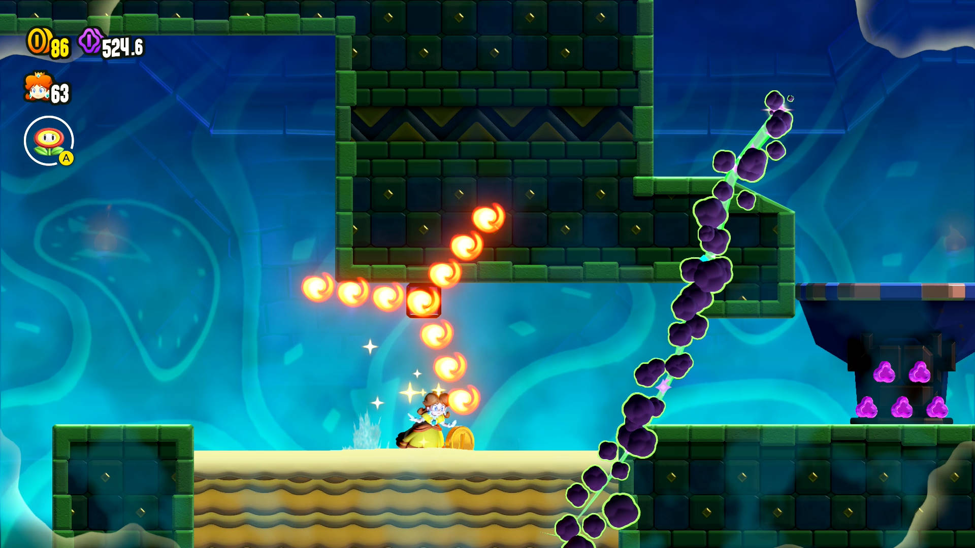 Shortly after the Wonder Flower effect begins, look for the a handle to pull near the brick blocks. A spiked ball will drop from above, so be ready to either jump over it while pulling or start pulling as soon as it passes.