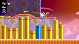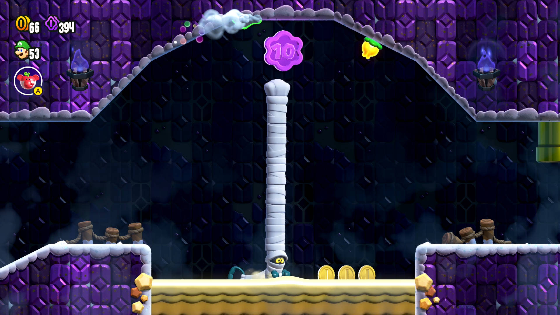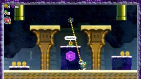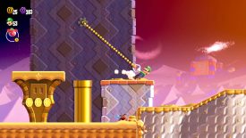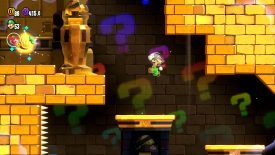 Pull the handle next to the Talking Flower to reveal this level’s Wonder Flower. Grabbing it will toss you into a pyramid infiltration. Chase after the Wonder Seed as it moves through the pyramid’s halls. Avoid the spiked wall by pulling the handle to raise two nearby platforms, then use them to reach the Wonder Seed.