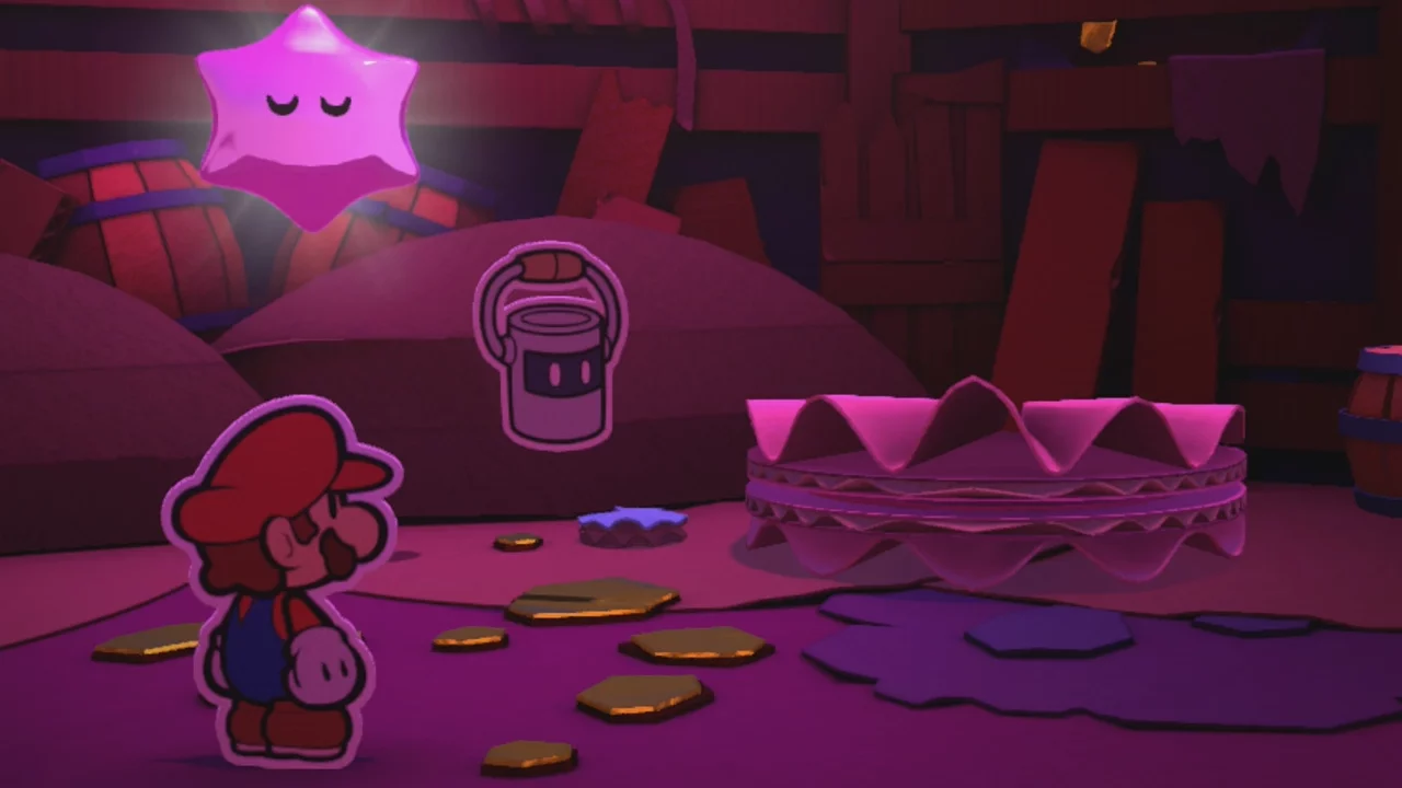 Walk up the stairs filled with spikes and the lanterns, but take note of exactly how everything looks! You’ll need to remember this for the parallel version. Walk into the skull door, then into the first hole you see. The Big Paint Star is in there! But so is a ton of smoke! No use in sticking around, so continue following the main path.