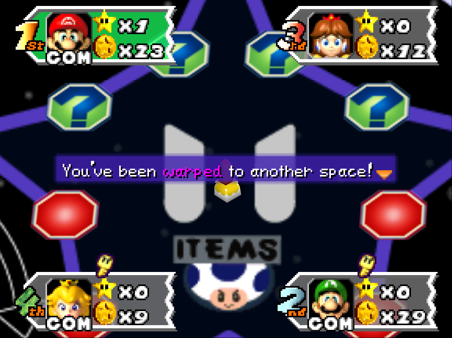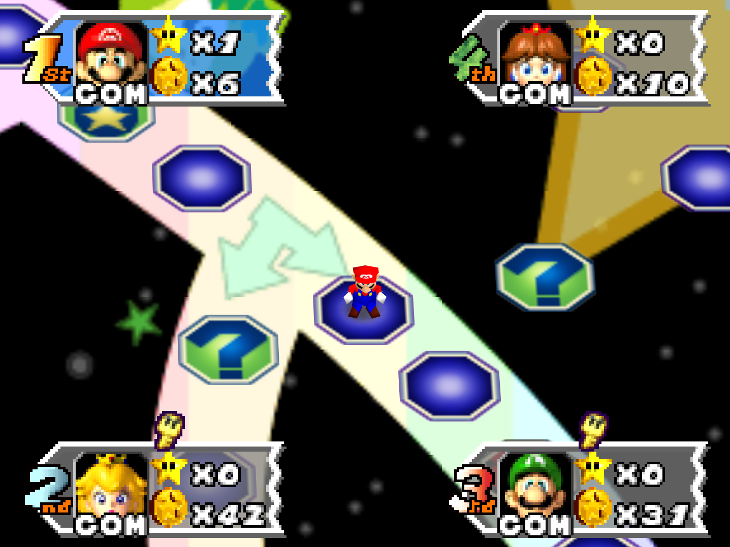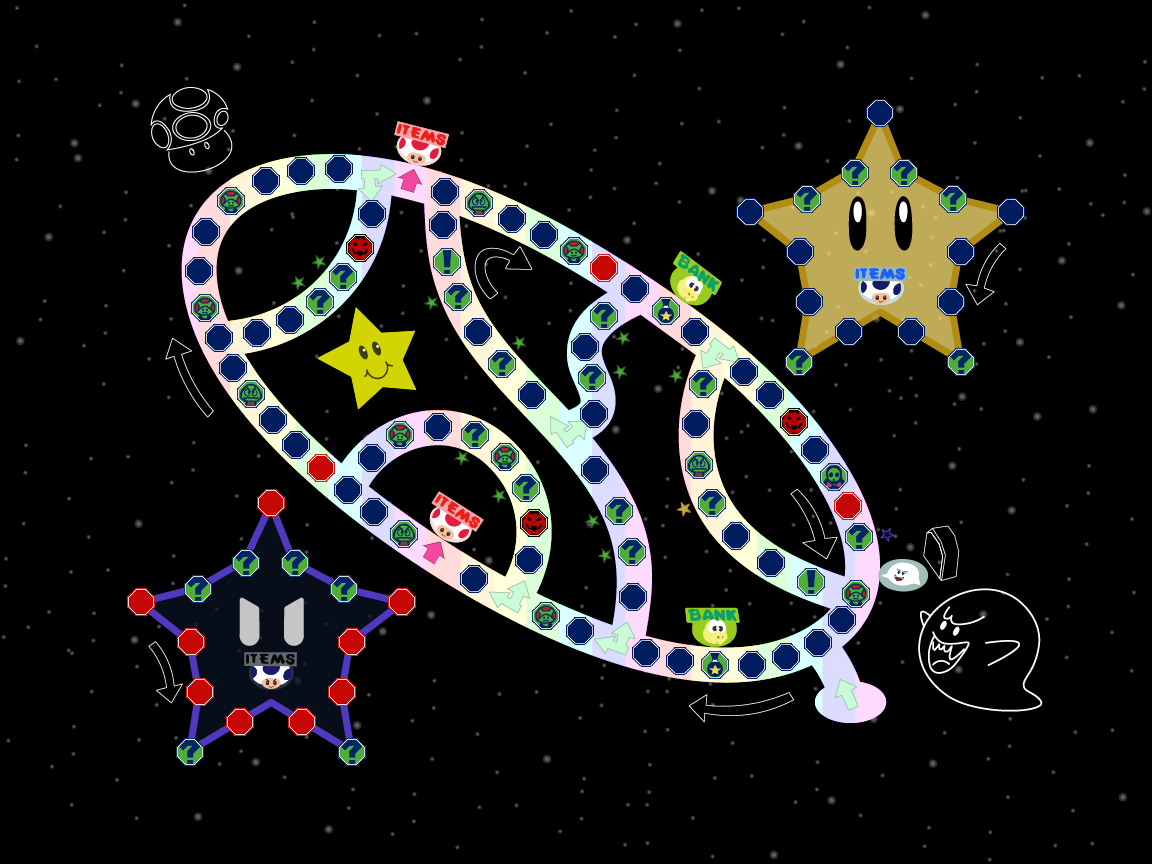 - Unlucky spaces that make you lose items, coins, or rarely a star